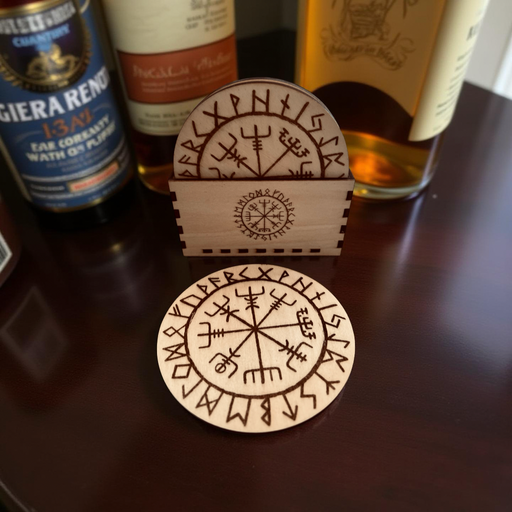 Dessous de verres et son rangement en contreplaqué de tilleul vernis orné du Vegvisir, compas runique islandais datant de l’ère viking. Connu pour guider les voyageurs et utilisé par les navigateurs, ce symbole apporte une touche d'histoire à votre intérieur tout en préservant vos meubles des marques de boissons.